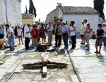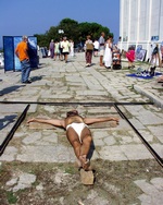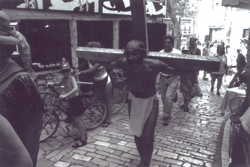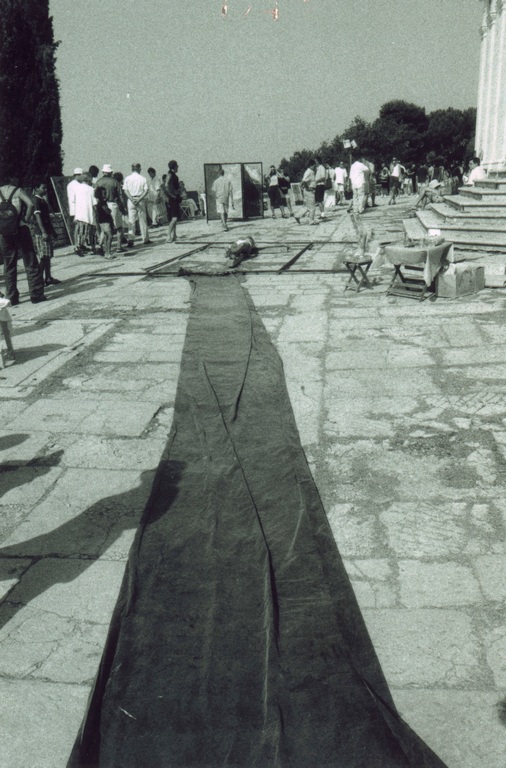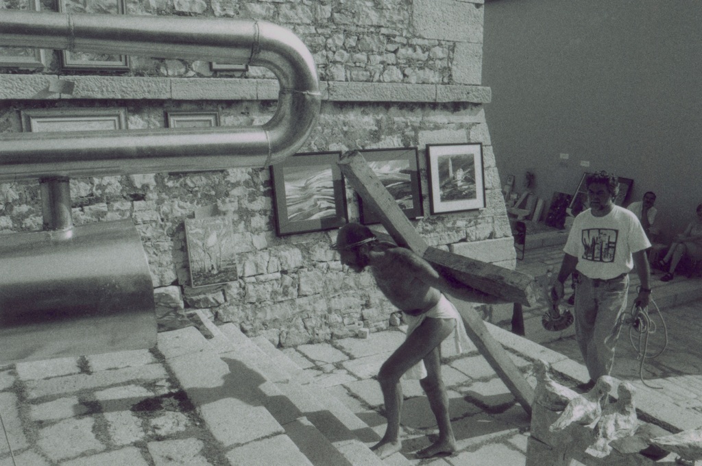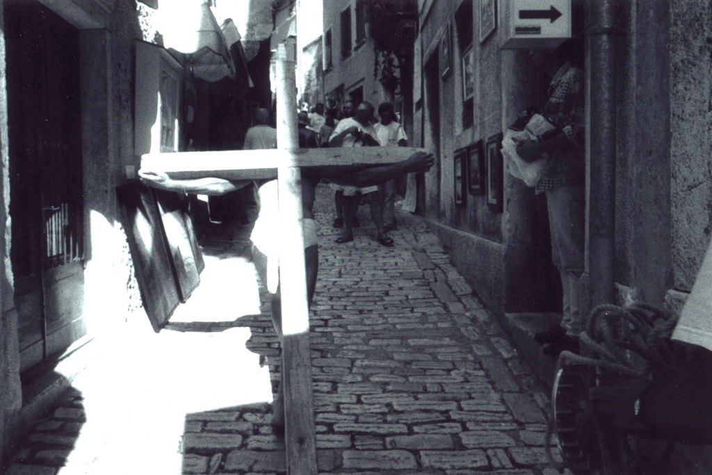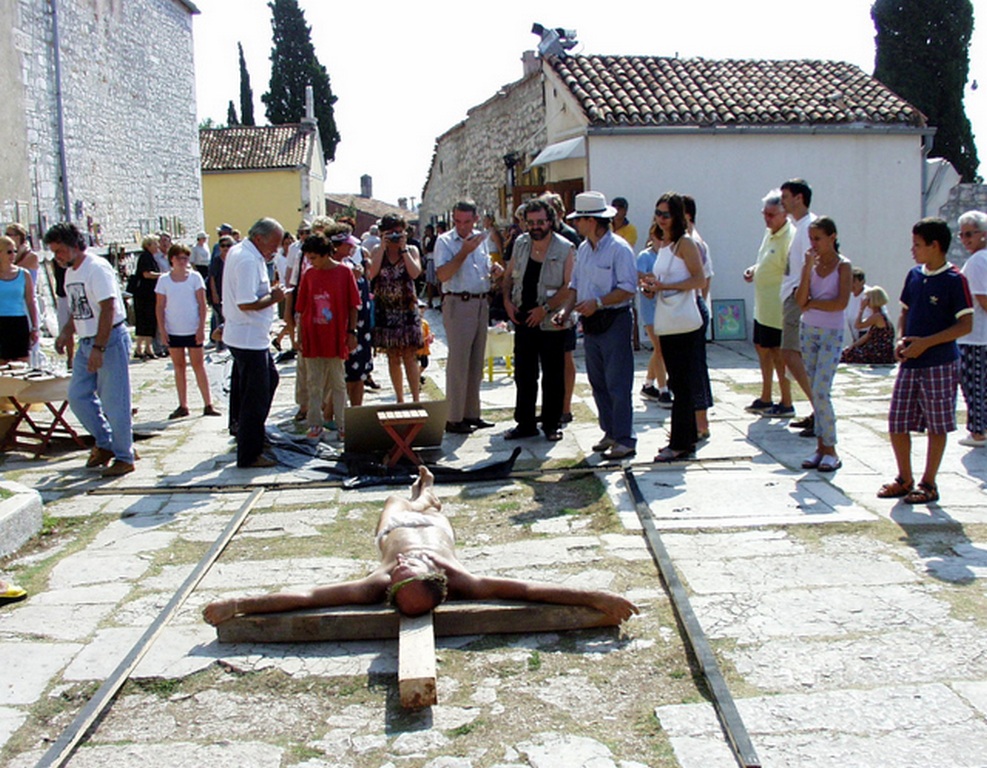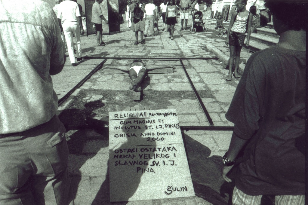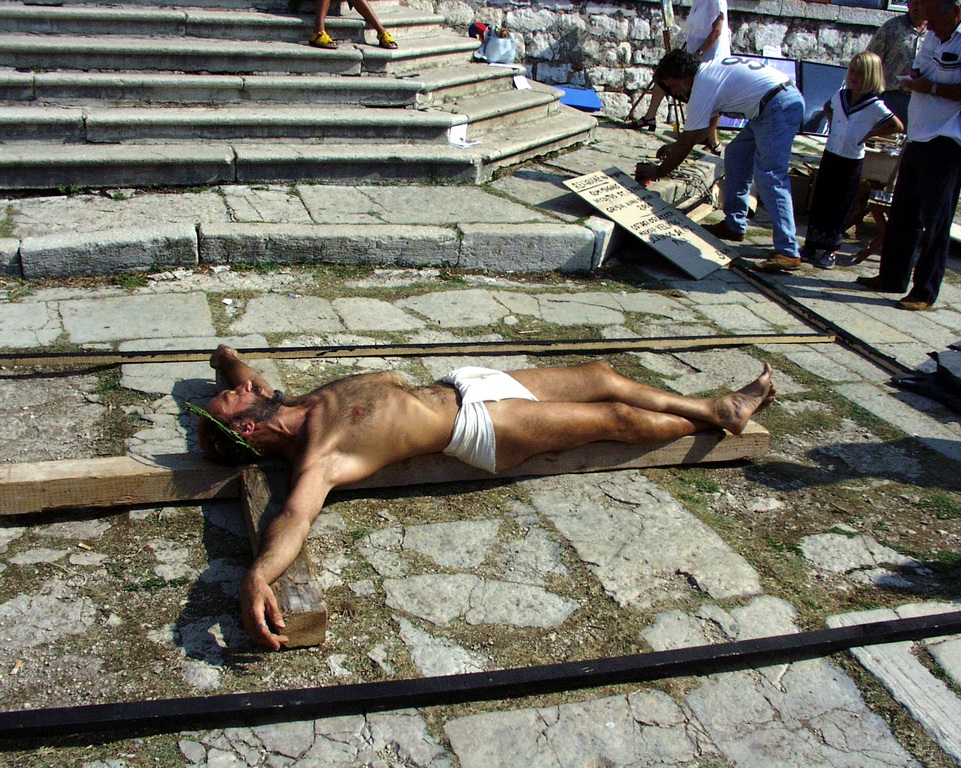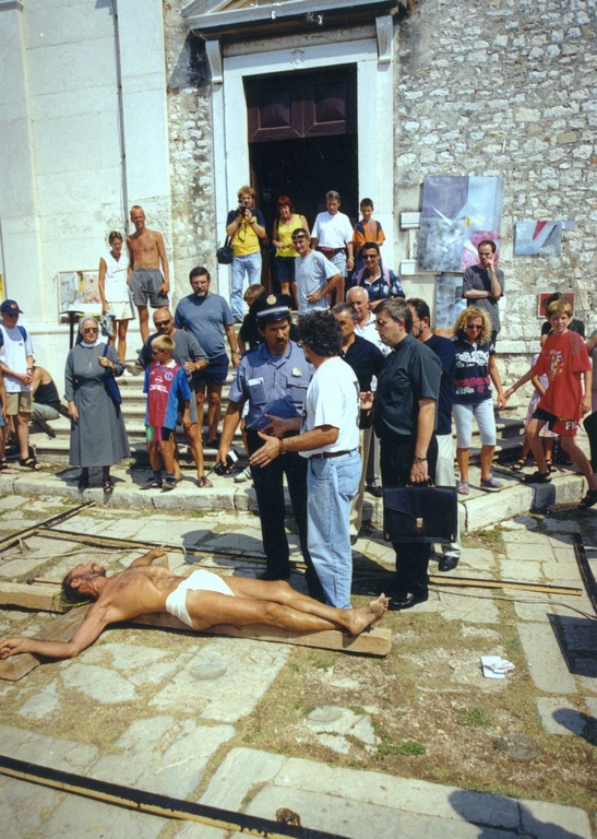 While performing, a Mass was being held inside the church. After Mass, a priest, who’d come out of the church and was shocked by our performance, immediately called the police. He explained we were insulting the Faith and didn’t have the right or license to use a man as Christ or to make of him for sale any relics. When a policeman arrived, he requested our identification for the purpose of prosecution, and we were forced to stop the performance. We were sued by the police for disturbing the peace, but the judge dismissed the case. This incident caused a big stir in Croatia regarding freedom of expression and the position of Church and State vis-à-vis individual freedom.